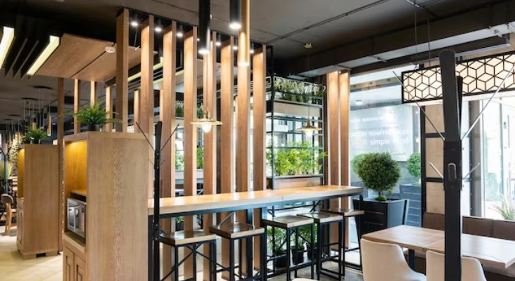 Model partisi ruangan pertama adalah desain sederhana yang disusun rapi secara linear untuk menciptakan pembatas yang menarik tanpa mengacaukan visual ruangan. Desain minimalis ini bukan hanya menyederhanakan estetika, tetapi juga memberikan kesan ruang yang terorganisir dan elegan. Keindahan alaminya terlihat melalui tekstur kayu yang kasar dengan memberikan sentuhan hangat pada ruang.