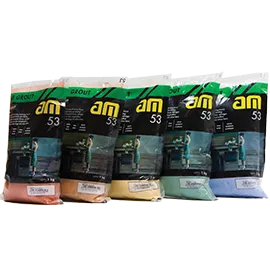 • Tuangkan 2,5 bagian AM 53 Powder sedikit demi sedikit kedalam wadah yang sudah berisi 1 bagian air bersih sambil diaduk hingga campuran berbentuk pasta