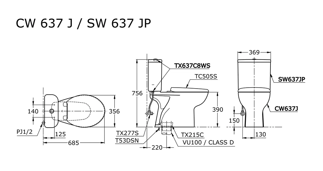 - TX637C8WS: Dual Flush Tank Trim w/o Stop Valve For SW637JP (4,3 / 3 Liters)