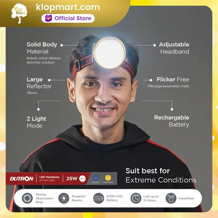Arah sudut cahaya dapat disesuaikan , serta menggunakan ikat kepala yang nyaman dan elastis