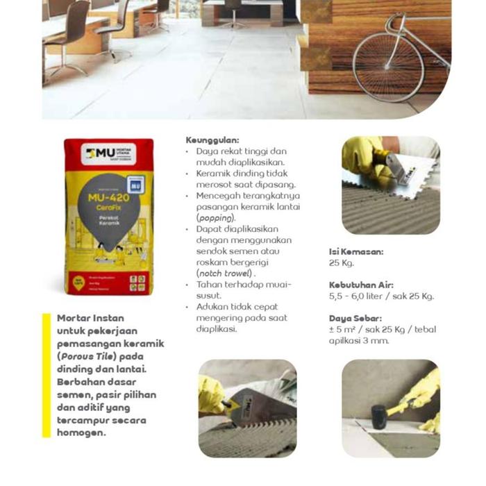 Dengan daya rekat yang kuat dan ketahanan terhadap perubahan dimensi, MU-420 CeraFix adalah pilihan sempurna bagi Anda yang menginginkan pemasangan keramik yang awet dan rapi. Produk ini dirancang untuk memudahkan aplikasi sekaligus memberikan hasil yang maksimal, memastikan keramik tetap terpasang dengan kokoh dalam jangka waktu yang lama.