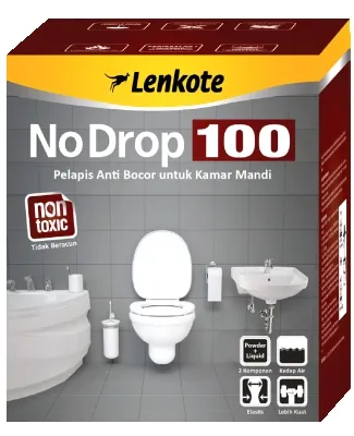 No Drop 100 adalah bahan pelapis anti bocor untuk kamar mandi yang terdiri dari 2 komponen yaitu powder berbasis semen dan liquid berbasis emulsi acrylic.