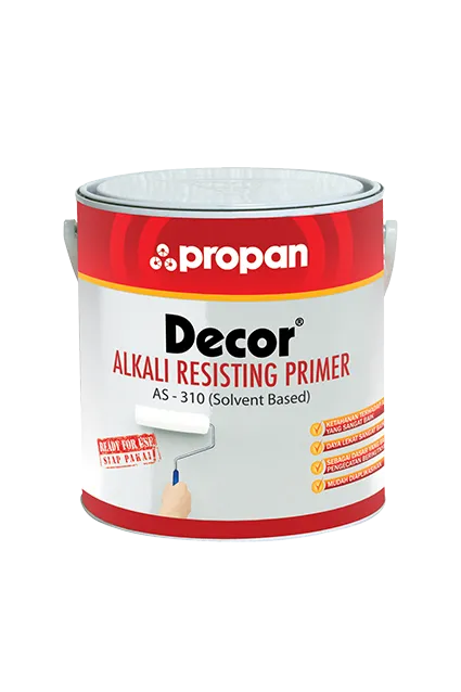 Decor Alkali Resisting Primer AS - 310 adalah cat dasar tahan alkali berbahan dasar solvent untuk tembok. Produk ini cocok untuk mengecat tembok baru seperti tembok beton, plaster semet, semen asbestos dan panel GRC. Sangat efektif untuk mencegah kerusakan cat oleh tingkat alkali yang sangat tinggi dari semen. DECOR ALKALI RESISTING PRIMER AS - 310 memiliki daya penetrasi dan daya lekat baik sehingga memberikan hasil yang sempurna untuk lapisan cat akhir.