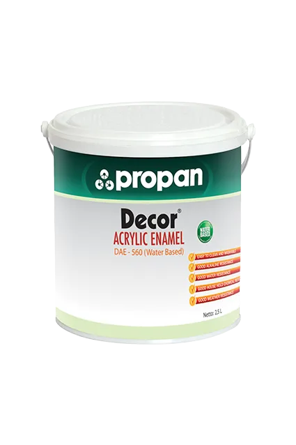 DECOR Acrylic Enamel DAE - 560 WB adalah cat acrylic gloss enamel water based yang terbuat dari bahan acrylic emulsion dan pigmen warna pilihan dengan system untuk pengecatan dinding interior dan eksterior area publik yang sering dilalui orang, area sekitar lift, koridor, area tangga darurat, area parkir dan area produksi pabrik & gudang, dengan ketinggian ± 1,2 meter dari lantai. DECOR Acrylic Enamel DAE - 560 WB memiliki daya lekat yang baik ke berbagai macam substrat seperti tembok pasangan batu bata/plesteran semen, beton, panel GRC, kayu, gypsum, dan lain-lain. Produk ini memiliki kualitas lapisan film yang tidak mudah kotor, mudah dibersihkan dan dapat dicuci, memiliki ketahanan yang baik terhadap cuaca, alkali, sinar UV, air, bahan kimia rumah tangga dan gesekan. Produk ini mudah diaplikasikan, cepat kering dan tersedia dalam berbagai warna pilihan.