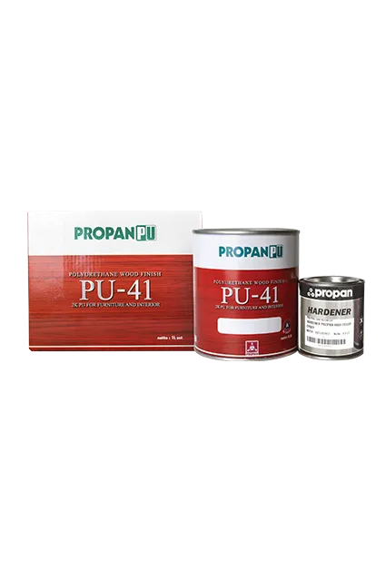 Adalah PU alkyd yang menghasilkan finishing tanpa bau pedas akibat emisi formaldehyd, pilihan yang tepat sebagai alternatif pengganti cat Melamik. Dengan harga yang lebih ekonomis, lapisan finishing PROPAN PU-41 lebih jernih sehingga menampilkan keindahan alami kayu. Top coat tersedia dalam 3 tingkatan : Clear Gloss (90 sheen), Semi Gloss (55 sheen) dan Clear Dof (15 sheen).