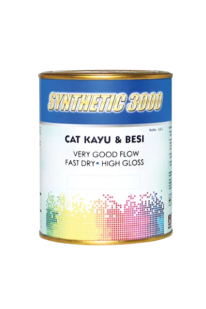 Adalah cat sintetik serbaguna siap pakai cocok untuk semua pengecatan kayu dan besi untuk interior maupun eksterior. SYNTHETIC 3000 tampil mengkilap, daya tutupnya sangat baik serta tahan cuaca. Produk ini cepat kering, mudah digunakan serta merata dengan baik dan tidak meninggalkan bekas kuas.