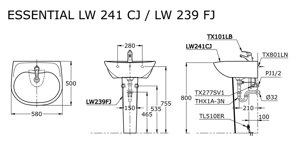 Toto Wastafel LW241CJ /LW239FJ merupakan jenis wastafel yang digantung pada tembok dengan pedestal atau kaki/penyangga yang sampai ke lantai.